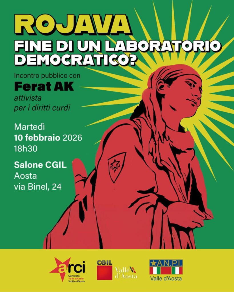 📌 Iniziativa partecipata riguardo al Rojava e al popolo curdo, organizzata da CGIL Valle d’Aosta, ANPI e ARCI, con la consapevolezza che conoscere ciò che sta avvenendo in Medio Oriente è oggi più che mai necessario, soprattutto per i popoli che vivono sotto occupazione e lottano per la propria autodeterminazione ✊.