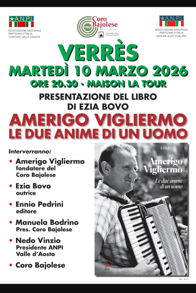 Martedì 10 marzo, alle ore 20.30, a Verrès presso Maison la Tour, l’ANPI propone una serata di presentazione del libro “Amerigo Vigliermo. Le due anime di un uomo”, autrice la giornalista Ezia Bovo.