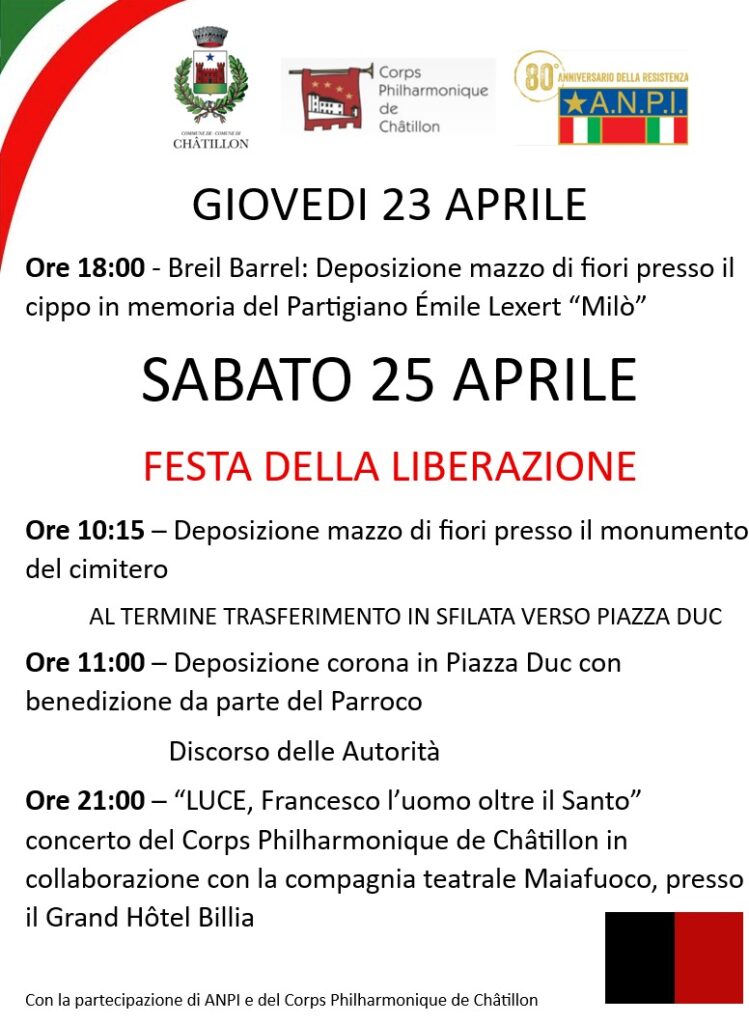 - Ore 18:00 – Châtillon: in località Breil Barrel, verrà deposto un mazzo di fiori al cippo in ricordo del Partigiano Émile Lexert “Milò”, ucciso proprio il 23 aprile dell’anno 1944 durante un’azione di sabotaggio alla centrale di Covalou.