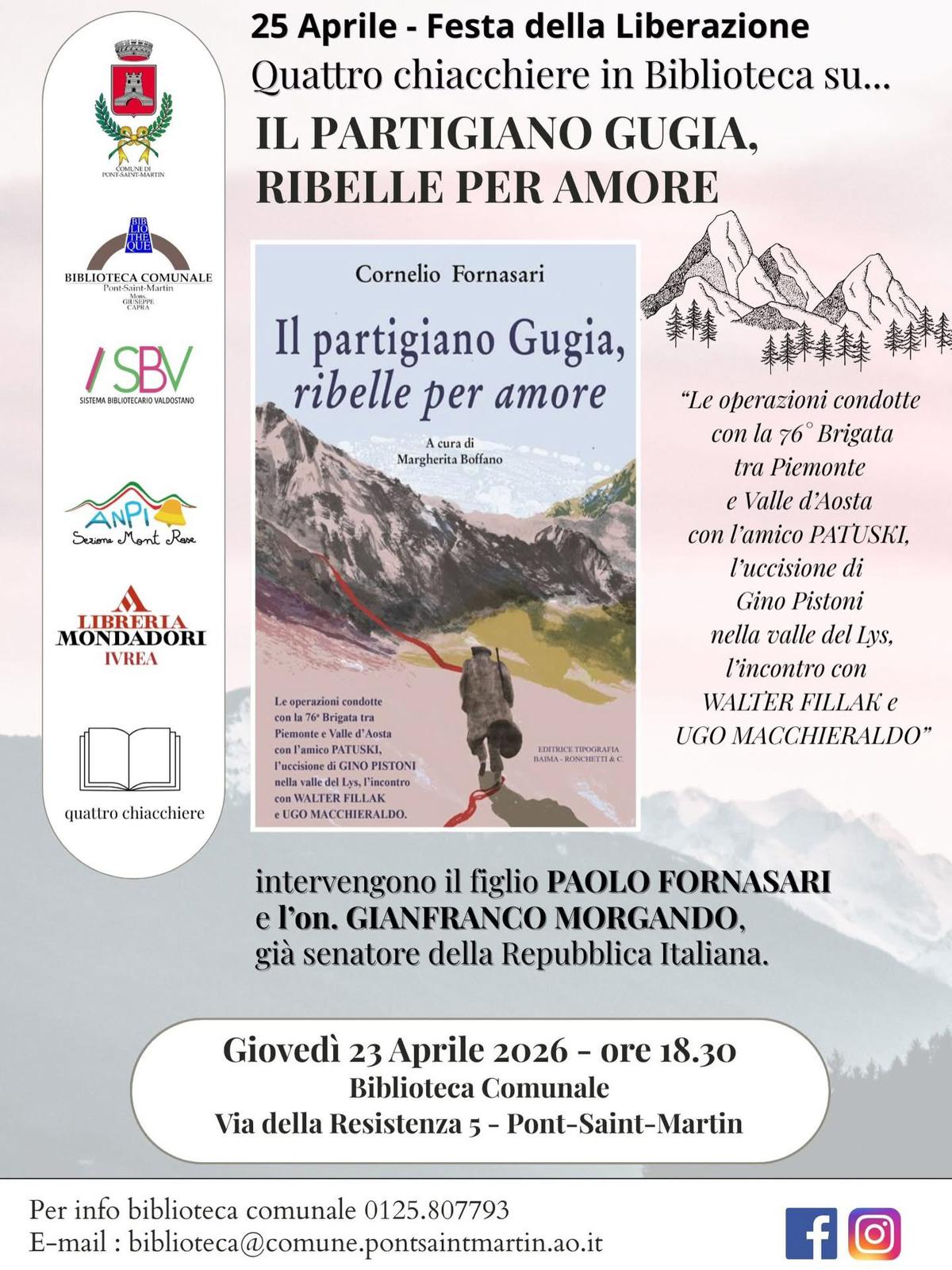 - Ore 18:30 – Pont-Saint-Martin: presso la Biblioteca Comunale, si terrà la presentazione del libro “Il partigiano Gugia, ribelle per amore” di Cornelio Fornasari. Un’occasione per riflettere sulle operazioni condotte dalla 76ª Brigata tra Piemonte e Valle d’Aosta, alla presenza di Paolo Fornasari e dell’on. Gianfranco Morgando.